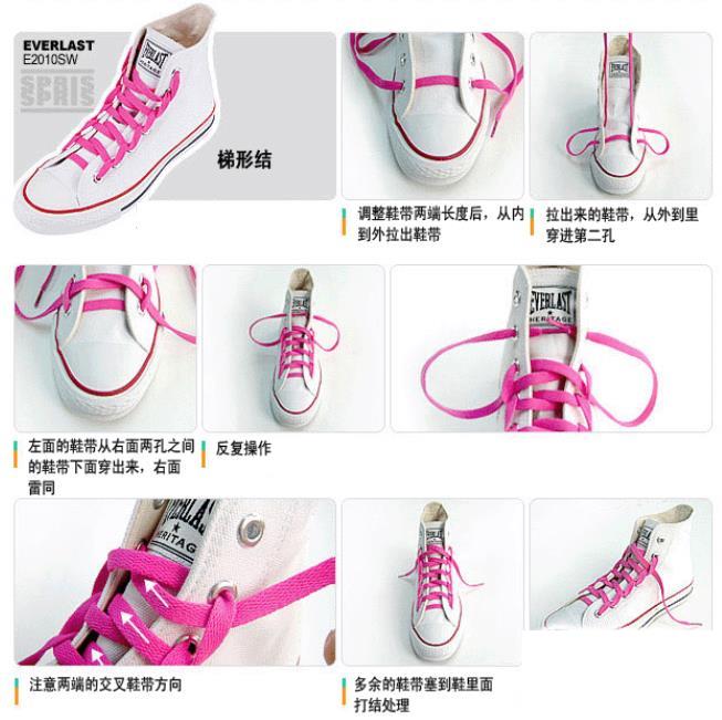 操作方法梯形结1.调整鞋带两端长度后,从内到外拉出鞋带;2.拉出来的鞋带,从外到里穿进第二孔;3.左面的鞋带从右面两孔之间的鞋带下面穿出来,右面雷同;4.反复操作;5.注意两端的交叉鞋带方向;6.多余的鞋带塞到鞋里面打结处理;7.完成后的梯形结。