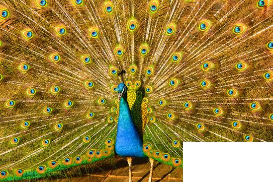 042、保护自己。在孔雀的大尾屏上,我们可以看到五色金翠线纹,其中散布着许多近似圆形的“眼状斑”,这种斑纹从内至外是由紫、蓝、褐、黄、红等颜色组成的。一旦遇到敌人而又来不及逃避时,孔雀便突然开屏,然后抖动它“沙沙”作响,很多的眼状斑随之乱动起来,敌人畏惧于这种“多眼怪兽”,也就不贸然前进了。