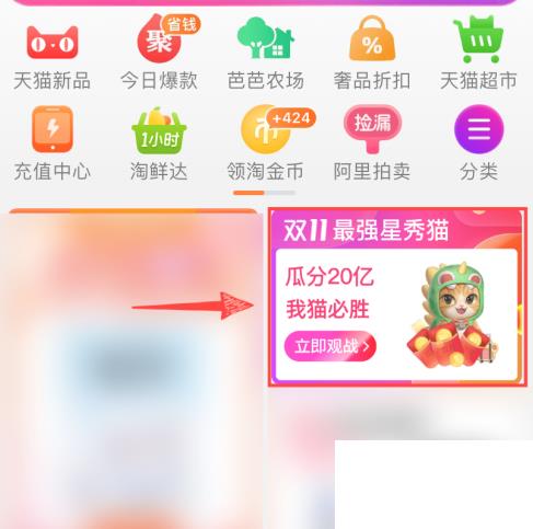 1、手机上打开“淘宝”软件,进入淘宝后找到双十一猫猫入口。