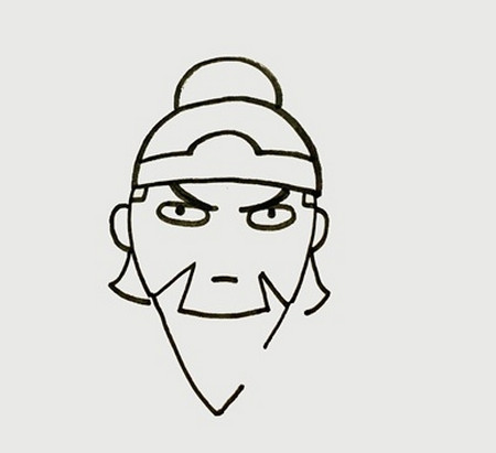先画关羽的头,头上戴着一顶帽子,眼睛睁得大大的,眉毛扬起来,耳朵贴在脸的两侧,胡子围在嘴上。