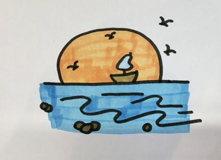 最后把夕阳涂成黄色,海水涂成较深的蓝色,就完成了美丽夕阳的简笔画。