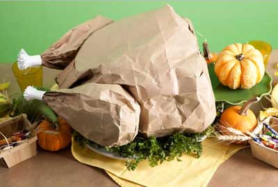 第五步:另一只纸袋火鸡的鸡腿也制作好之后,我们可以用白乳胶或者胶枪将自己制作的鸡腿粘贴在感恩节纸袋火鸡的身上。贴的时候,我们会把鸡腿贴在感恩节火鸡的身体一侧。效果如图所示。在详细粘贴的过程中,也要注意不要造成膨胀的纸袋被压缩。只需做出如图所示的最终效果即可。如果是处于一定的塌陷状态,可以用手指或者铅笔对里面进行重塑,然后让袋子膨胀起来。