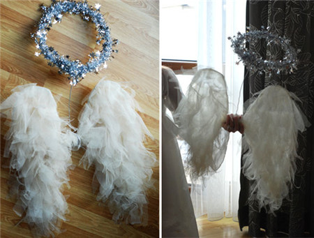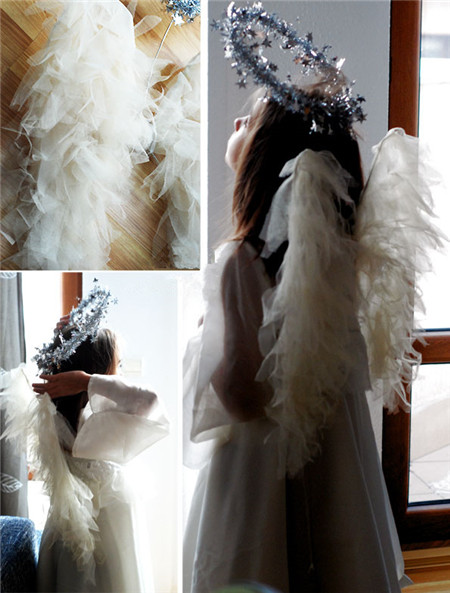 第五步:把天使光环和两翼固定在一起,然后在两翼固定两条背带,然后让宝宝穿上小白裙,把翅膀放在背上,小天使就会打扮起来~