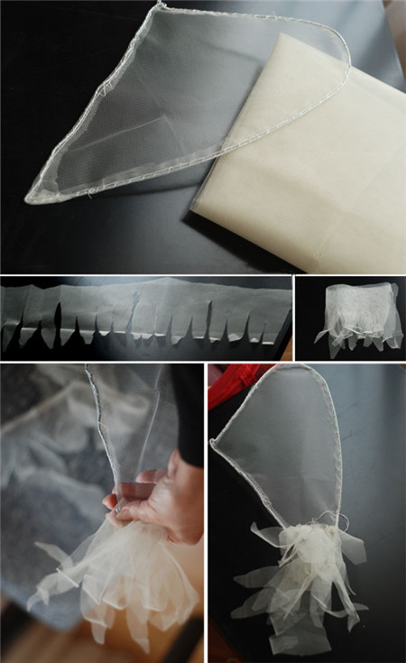 第三步:将白纱切成条状,然后将其形状切成如图所示的形状,折叠在一起,稍微收紧并固定在翅膀下面,然后一层一层地叠在网上,注意白纱的密集折叠。