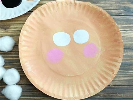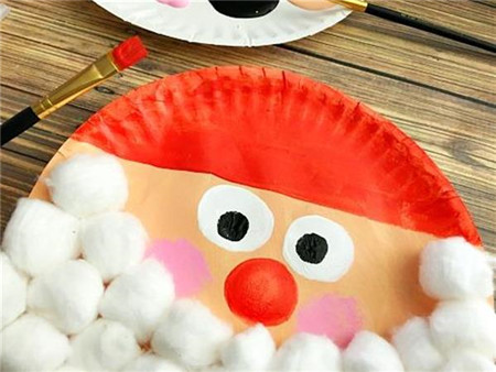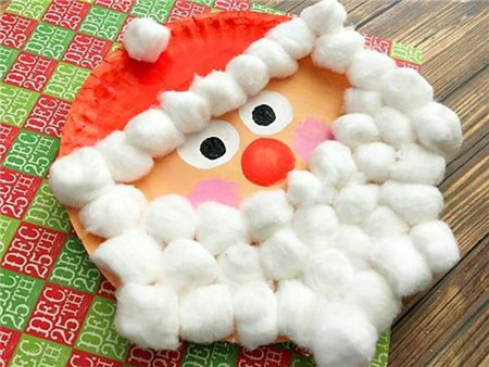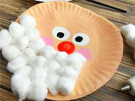 第四步:将棉球一个一个的粘在纸盘下部,注意要像圣诞老人的胡子一样粘得紧紧的。