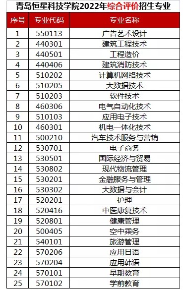 2022青岛恒星科技学院单招和综合评价招生专业有广告艺术设计、工程造价、环境艺术设计、计算机网络技术、电子商务、汽车技术服务与营销、汽车检测与维修技术等。