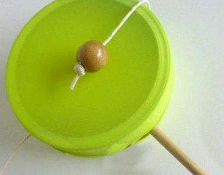 绳子两端系上木珠,一个简单的拨浪鼓就完成了。