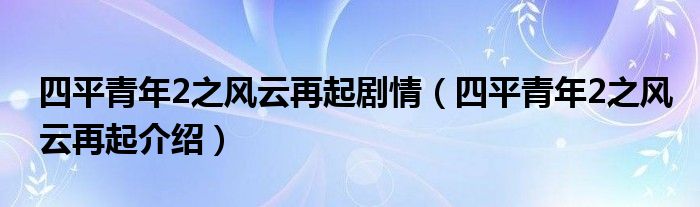 大家好,伊人来为大家解答以上问题。四平青年2之风云再起剧情,四平青年2之风云再起介绍很多人还不知道,现在让我们一起来看看吧!