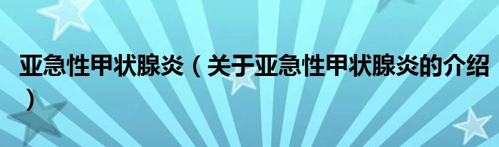 大家好,小新来为大家解答以上的问题。亚急性甲状腺炎,关于亚急性甲状腺炎的介绍很多人还不知道,现在让我们一起来看看吧!