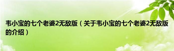大家好,小新来为大家解答以上的问题。韦小宝的七个老婆2无敌版,关于韦小宝的七个老婆2无敌版的介绍很多人还不知道,现在让我们一起来看看吧!1、韦小宝的七个老婆2是一款策略类游戏。本文到此结束,希望对大家有所帮助。
