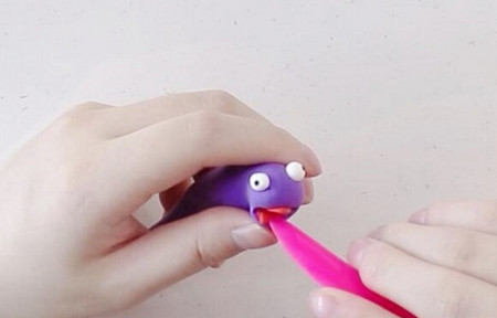 1.先拿出一团紫色的黏土捏出蜥蜴细长的身形,再戳出两只眼睛的轮廓。