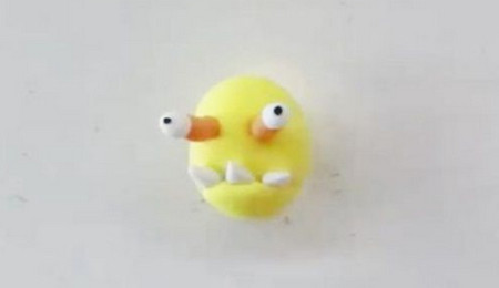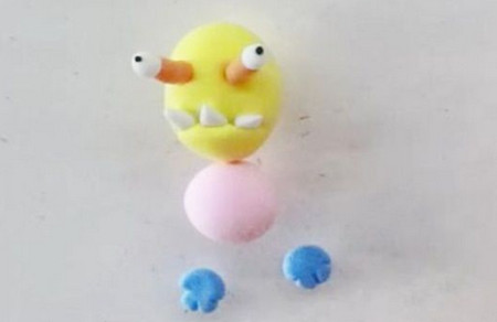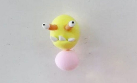 首先,用黄色粘土做一个圆圈作为外星人的头,然后在上面贴上三颗眼睛突出的锋利牙齿。