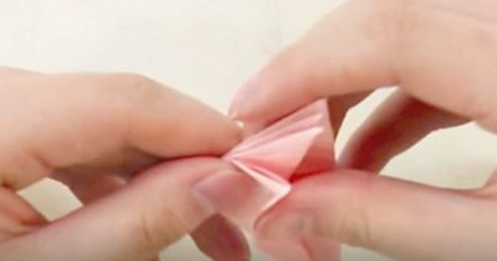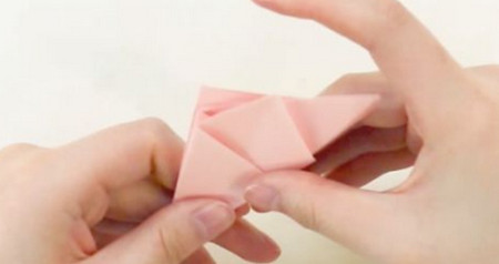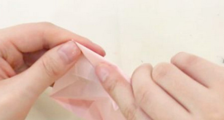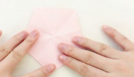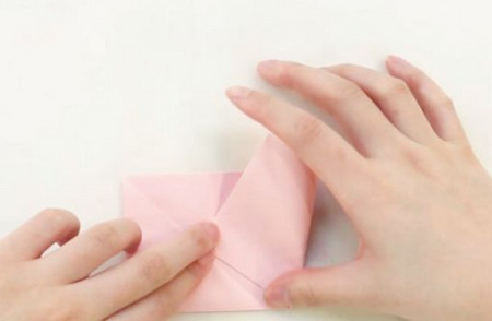 1.首先,准备一个粉红色的方形折纸。沿中心线折叠后,以一条短边为边长,将正方形的中心点折出,另一个角与这个中心点重叠。