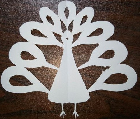 最后用剪刀把孔雀剪开,把需要挖空的部分挖空。这样,孔雀的剪纸就完成了。