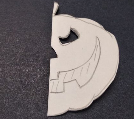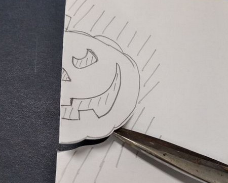 你可以先把南瓜的形状切出来。从下面开始,沿着画线从左向右切割。