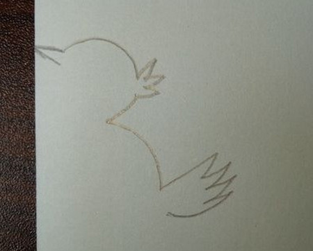 将纸板在中间对折,在中线处画出鸟的嘴和头。将鸟头上的羽毛画在头线的末端。