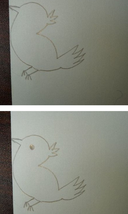 如图所示,将鸟的眼睛部分挖空,然后用剪刀将鸟剪掉,这样关于鸟的剪纸就完成了。
