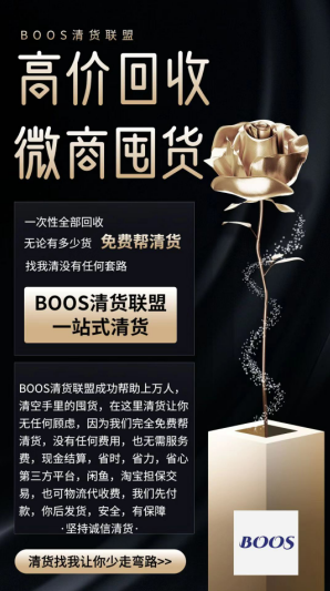 Boos清货联盟是一个为微商囤货的亲们解决清货难题,我们是现金一次性给您收购,让您的尾货、积压的囤货一次性变现;而且是通过闲鱼、淘宝上进行交易,我们先付款您后发货,不收取任何服务费和手续费,没有套路的安全交易模式!让您更加踏实!更加放心!真心为您解决积压货物的后顾之忧!初晴微信:yue4053