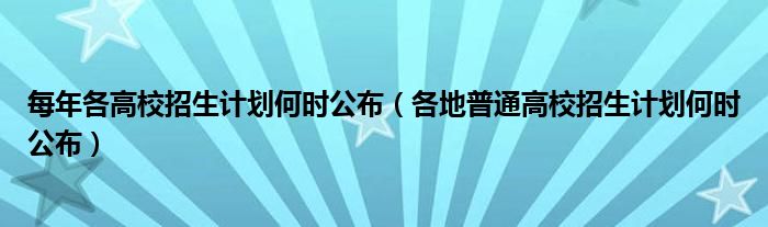 1、5月初至6月中下旬。各地的普通高校招生计划的公布时间一般是在即将开始填报高考志愿的5月初至6月中下旬就会公布出来,不过具体高校招生计划什么时候公布还会因为各个地方的政策不同而出现差异。