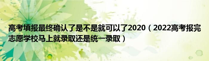 大家好,小高来为大家解答以上问题。高考填报最终确认了是不是就可以了2020,2022高考报完志愿学校马上就录取还是统一录取很多人还不知道,现在让我们一起来看看吧!