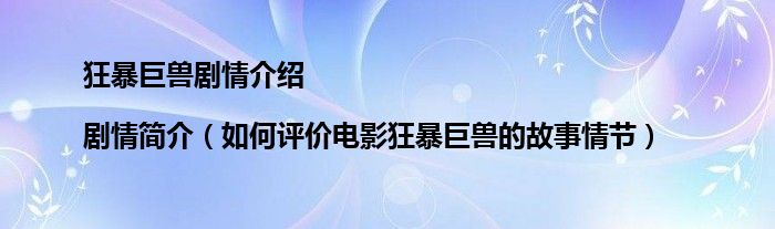 大家好,小生来为大家讲解下。狂暴巨兽剧情介绍|剧情简介,如何评价电影狂暴巨兽的故事情节很多人还不知道,现在让我们一起来看看吧!